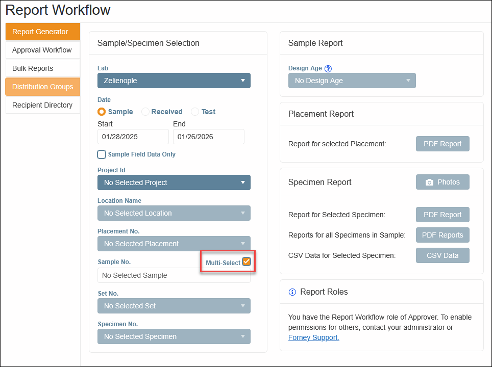 - From the Report Generator page, check the Multi-Select option to enable the selection of multiple samples.