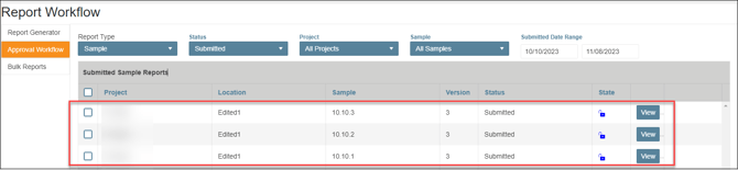 Users can submit multiple Samples for approval within a selected timeframe to generate comprehensive reports of their test results, regardless of project.