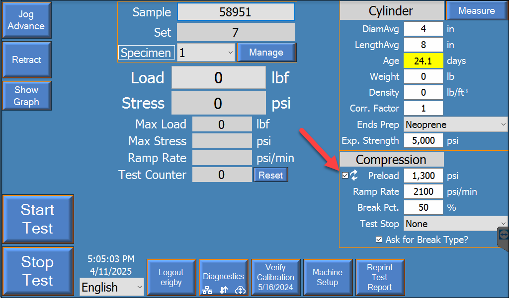 ForneyVault includes an Auto Preload feature that calculates and adjusts preload automatically based on specimen data and prior test results. Preload is used to ensure the specimen is fully seated and the machine is applying load under controlled conditions before the test is measured.